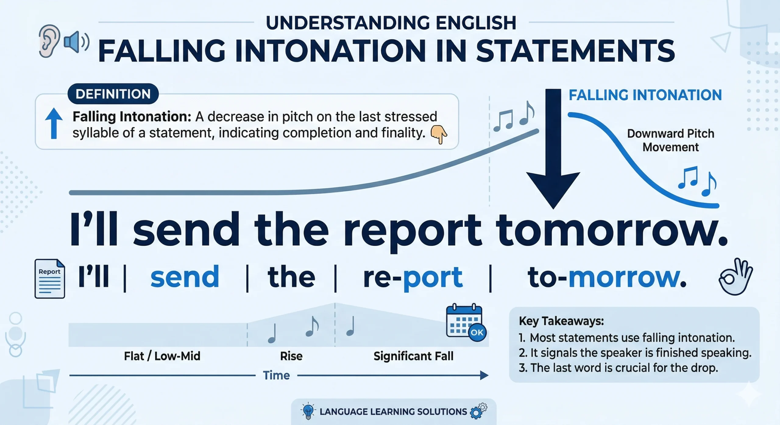 - Statements end falling. The pitch drops on the final stressed content word. Practice ending sentences with a deliberate, audible downward movement: