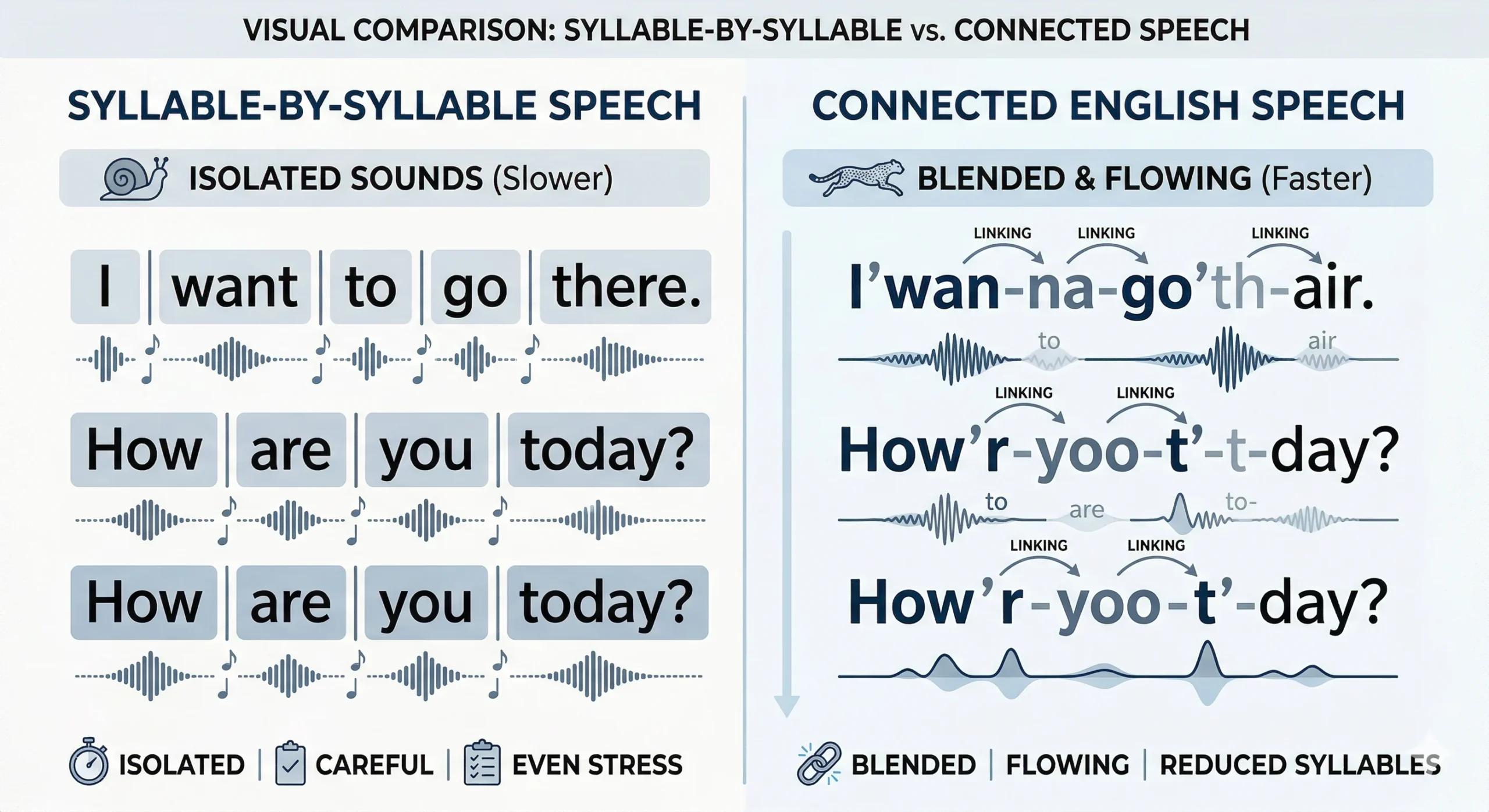- Listen for connected speech — notice how words blend together in natural English, how function words nearly vanish, and how the overall effect is fluid rather than syllable-by-syllable