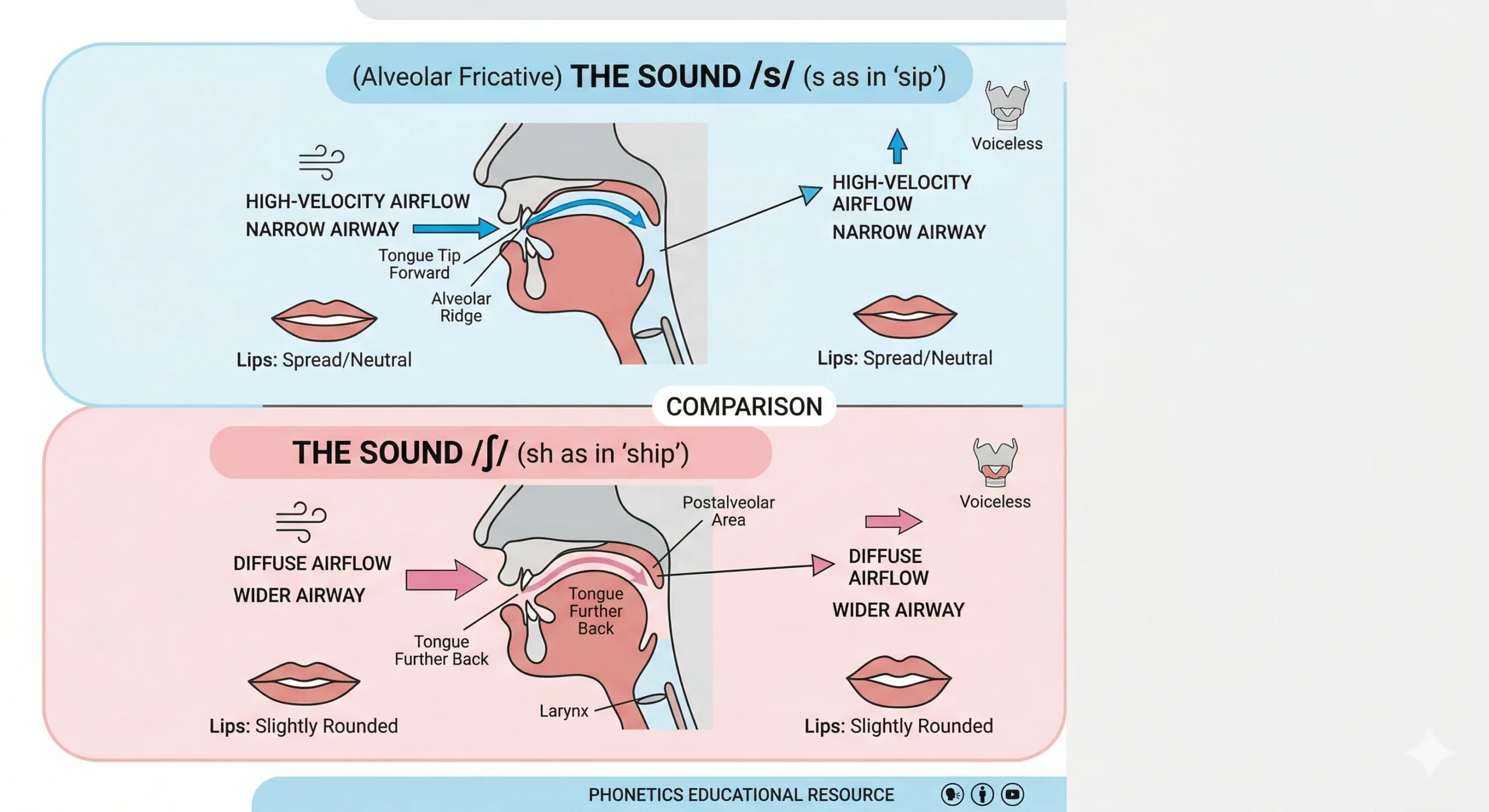 - Search “American English /sh/ pronunciation” for /ʃ/ articulation tutorials