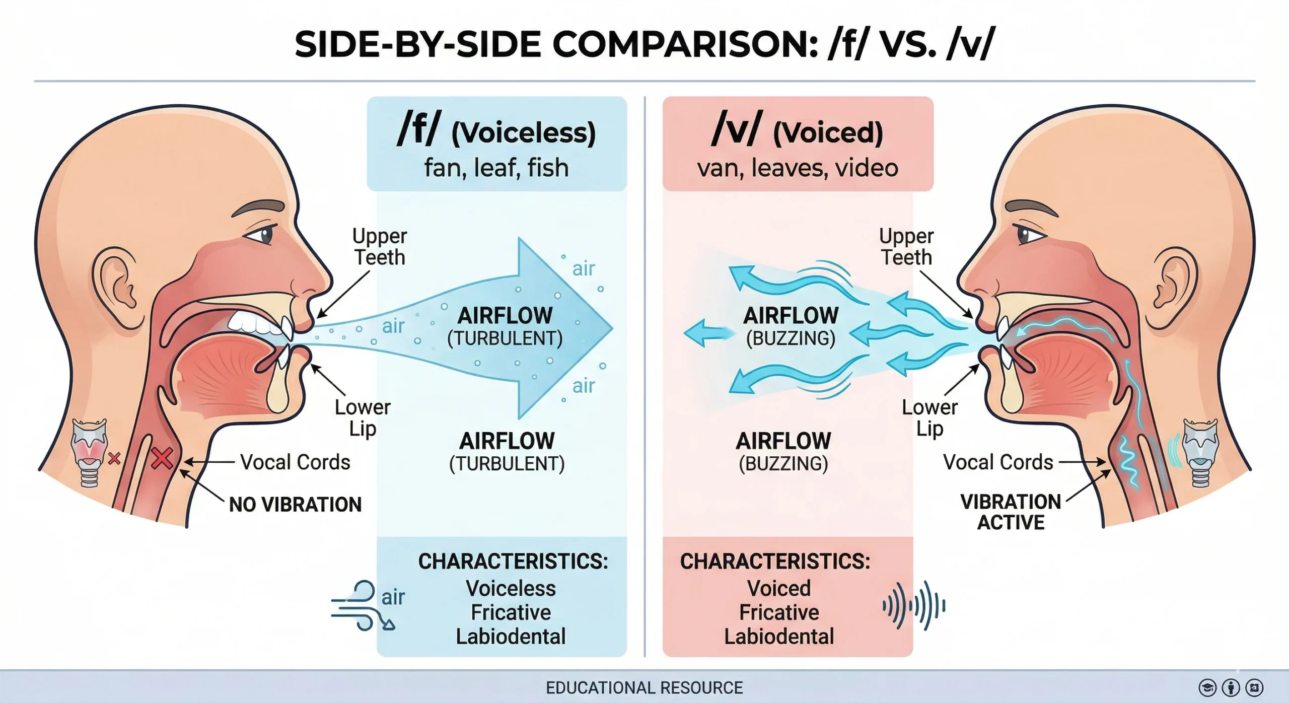 Finnish pattern: /f/ replaced with /v/ — “five” sounds like “vive,” “for” sounds like “vor,” “first” sounds like “virst,” “after” sounds like “avter” Clear English: /f/ is voiceless — upper teeth rest on lower lip, airflow through, but no vocal cord vibration. The key distinction from /v/: no buzz, no voicing