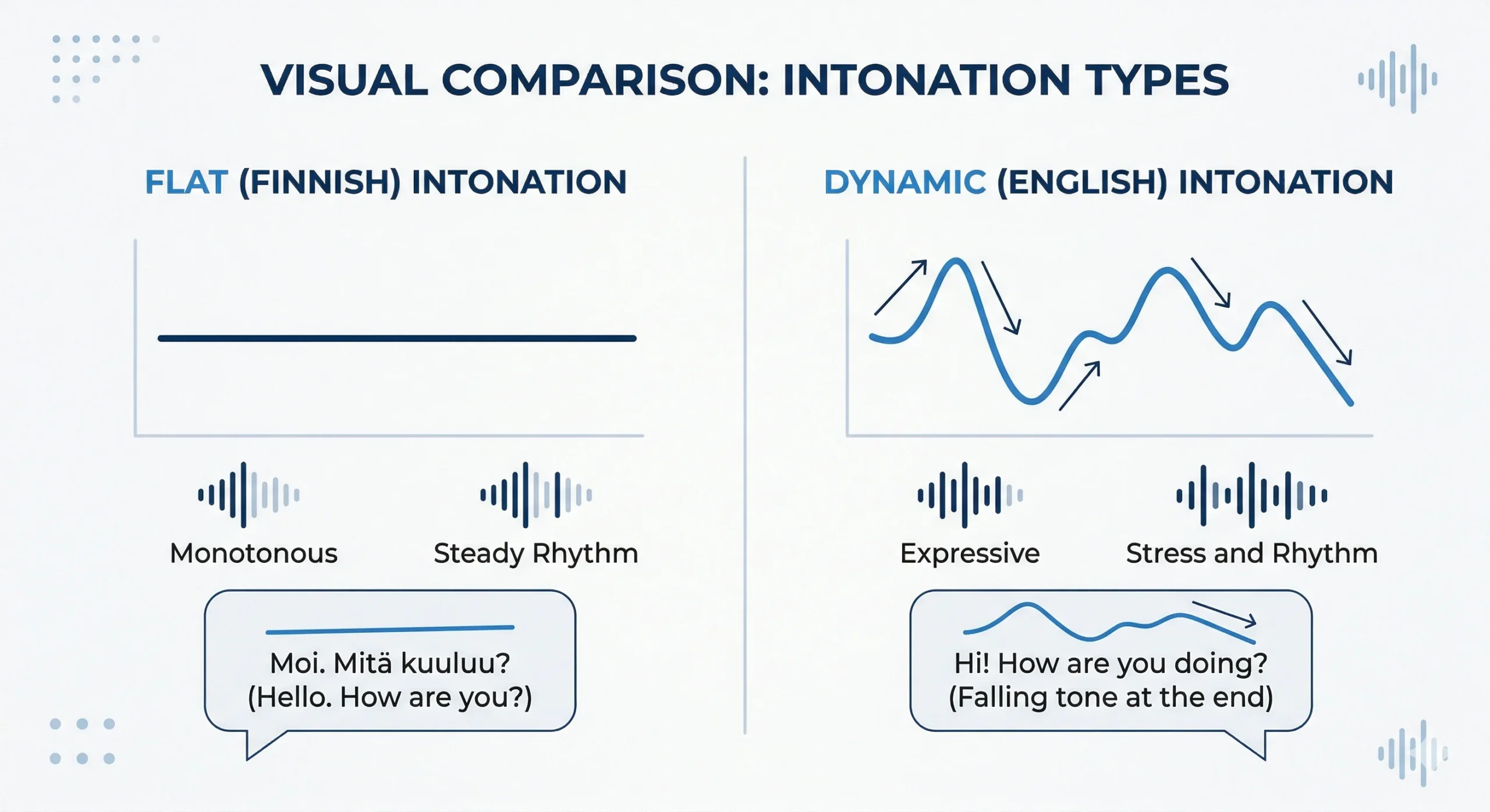 Finnish pattern: Flat, level intonation — speech sounds monotone or robotic; insufficient pitch variation across sentences Clear English: English uses a wide, dynamic pitch range — stressed content words get a pitch peak, unstressed words stay low, and statements close with a clear falling pitch