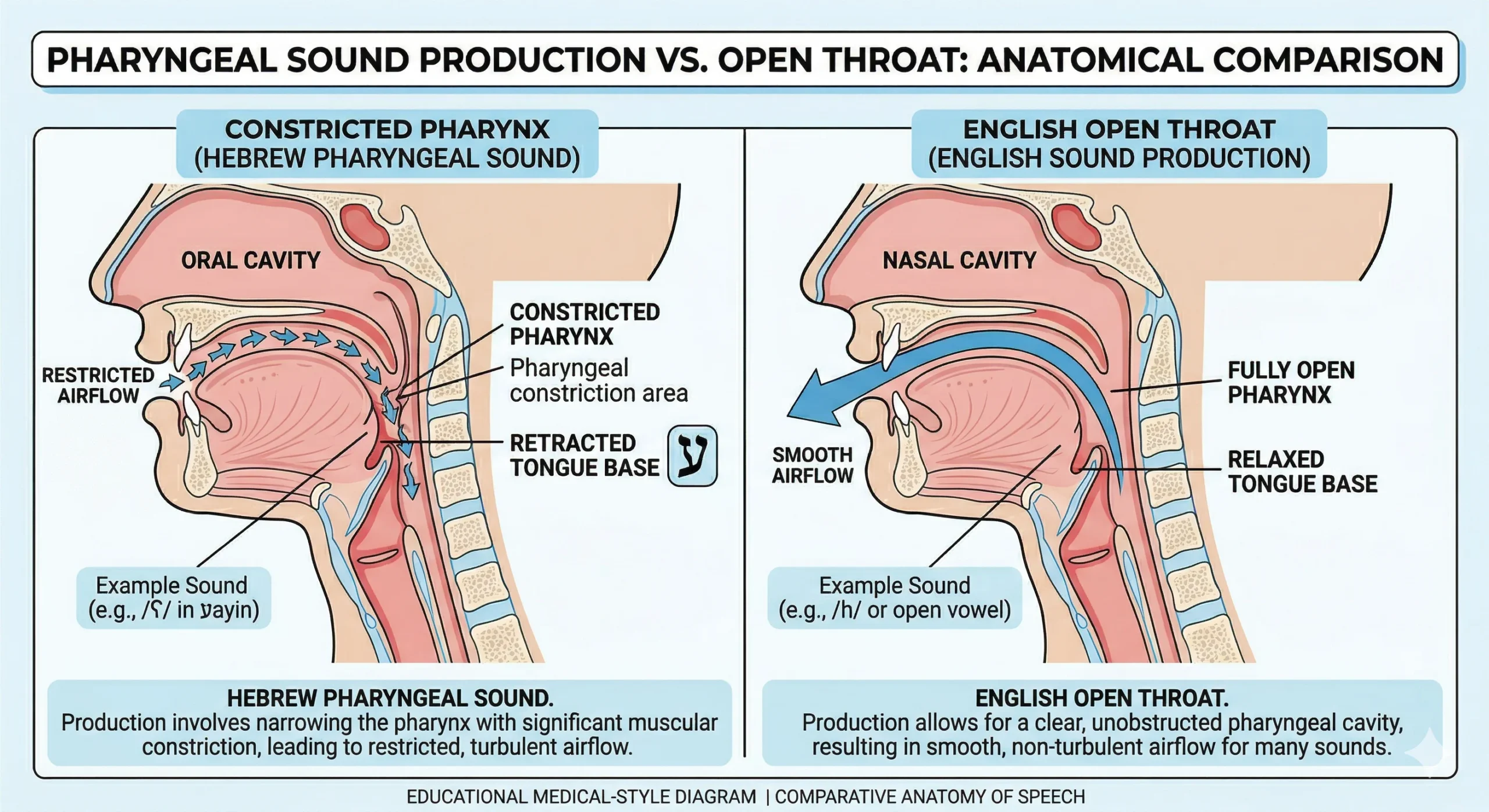 The fix for pharyngeal coloring is not about drilling a new consonant — it’s about consciously opening and relaxing the throat, particularly on English /h/ words and in syllables that would contain ח, ע, or כ in the Hebrew equivalent.