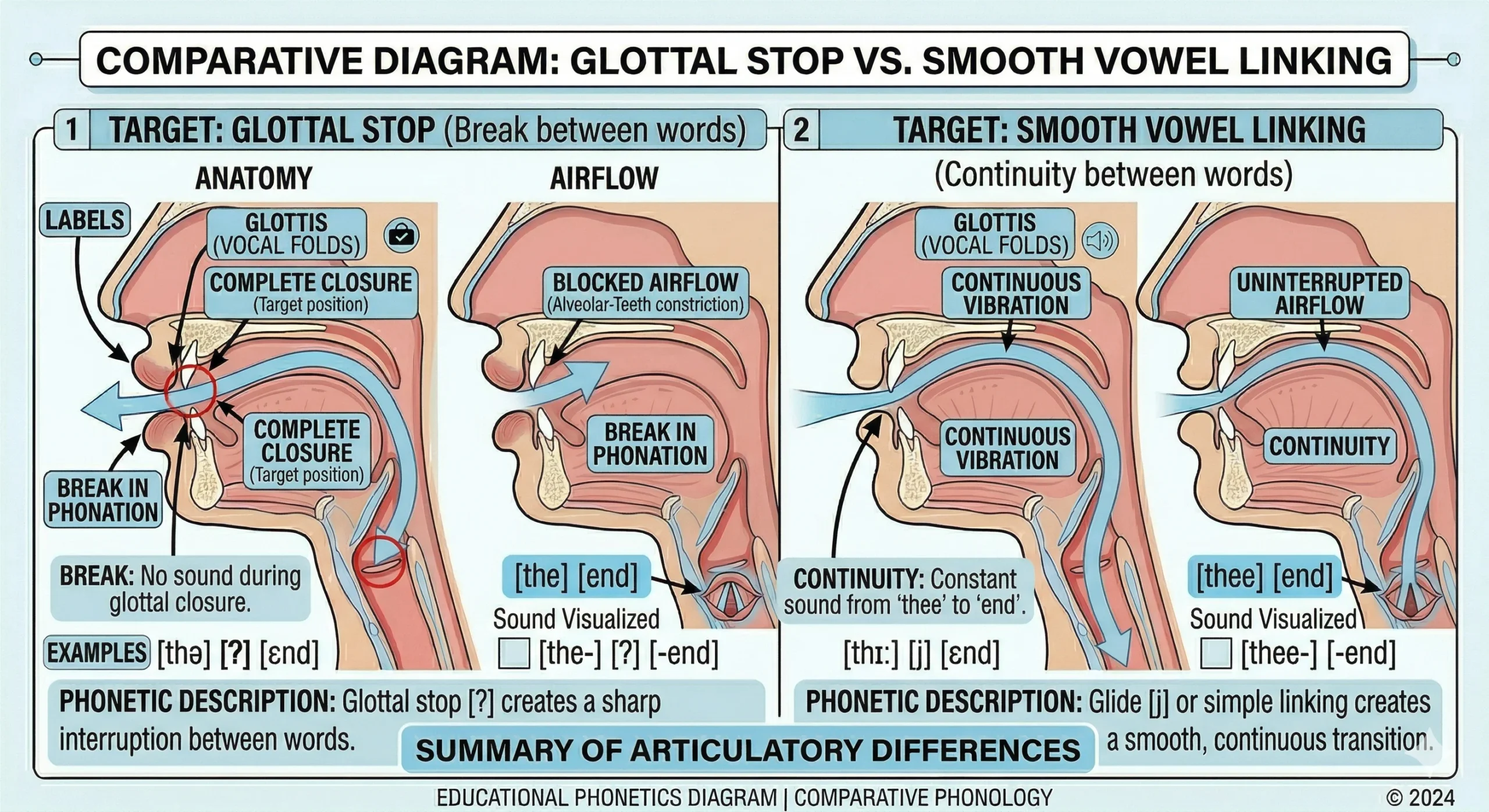 - Practice linking: “the end” → “thee-end” (smooth), “go out” → “go-wout” (the /w/ glide links them), “see it” → “see-yit” (the /j/ glide links them)
