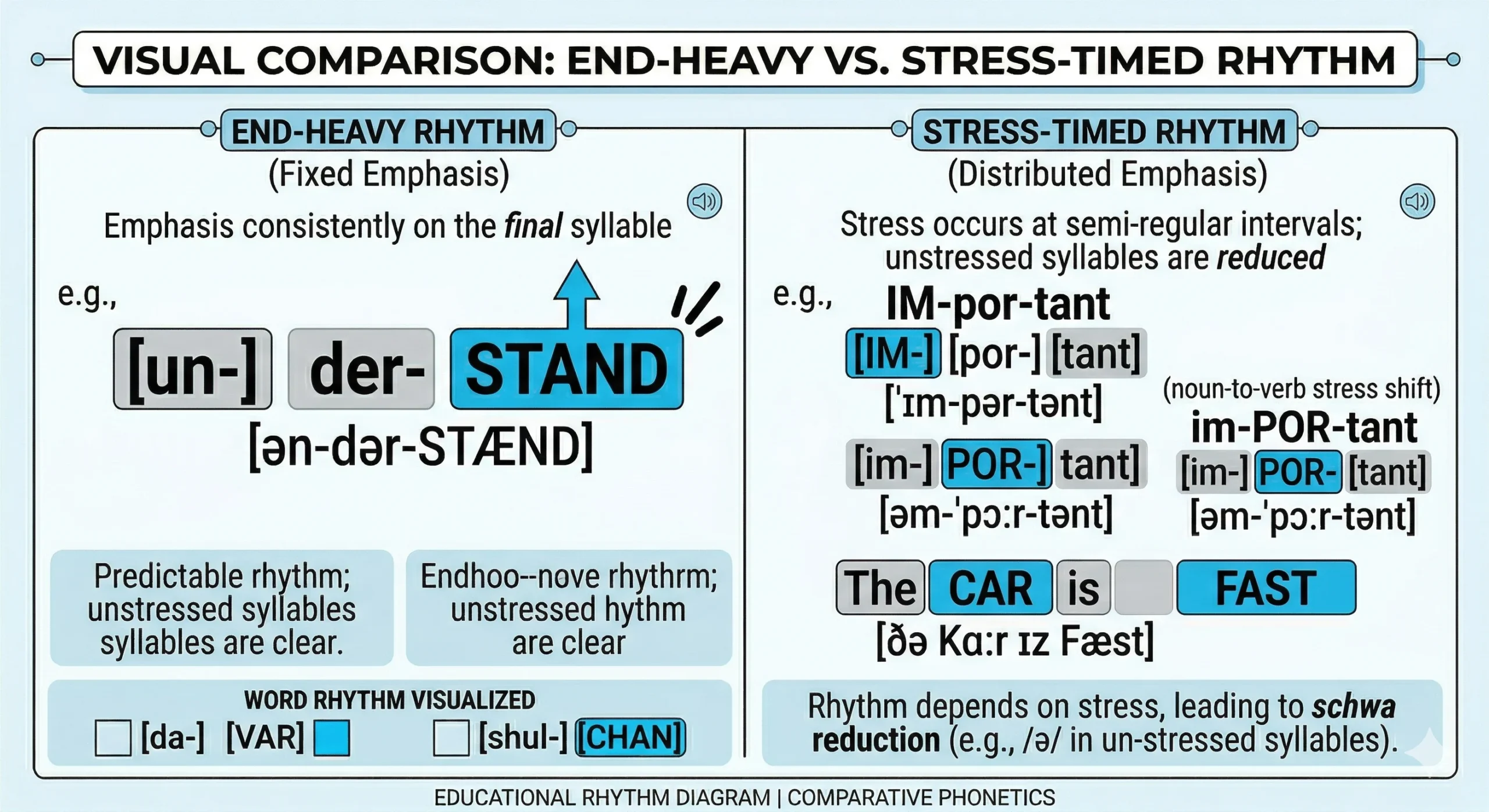 - Unstressed syllables: dramatically compressed, reduced toward schwa /ə/, quieter and shorter