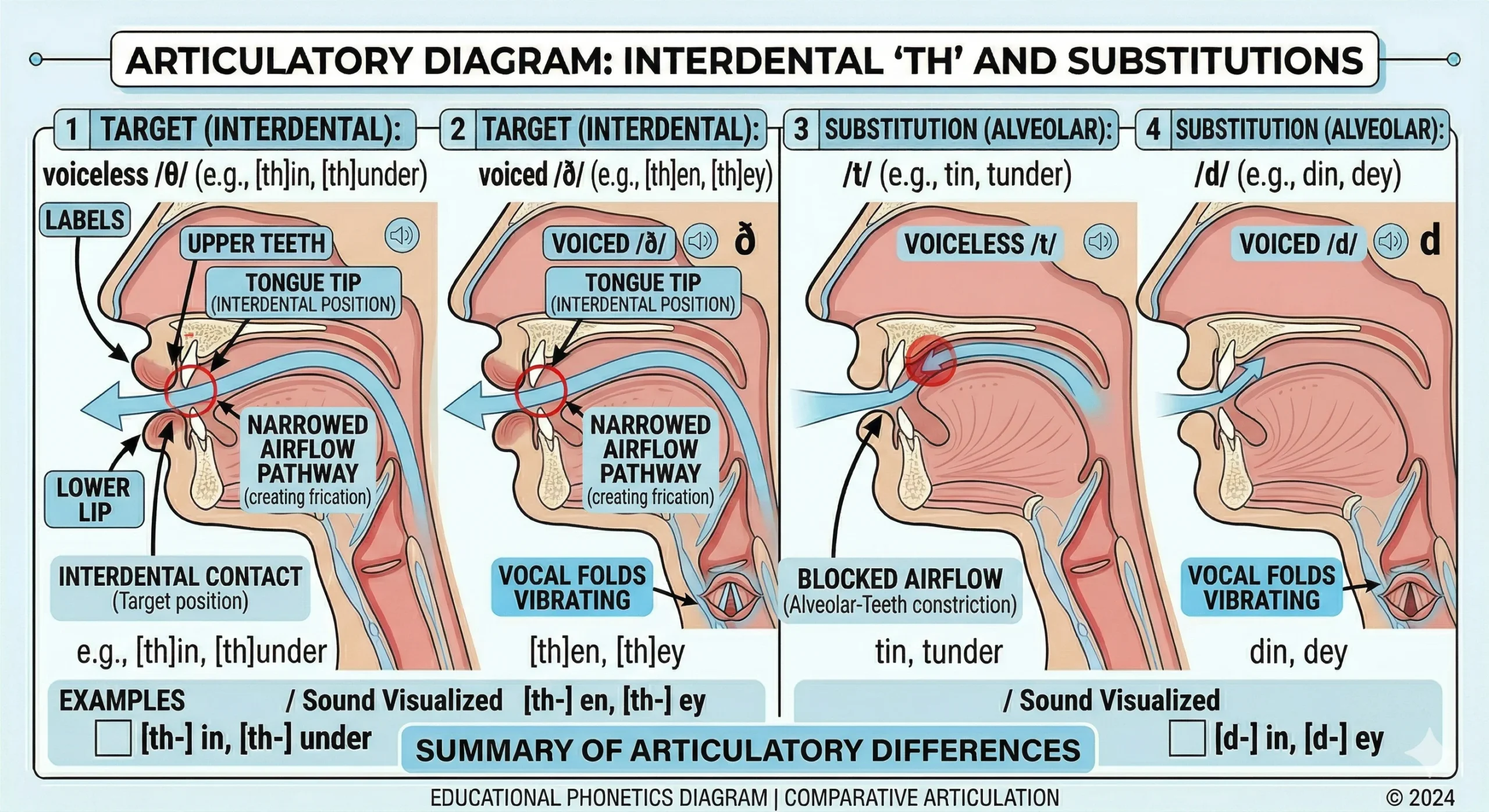 - The key difference from /t/ and /d/: no pressure buildup and stop release — /th/ is continuous airflow