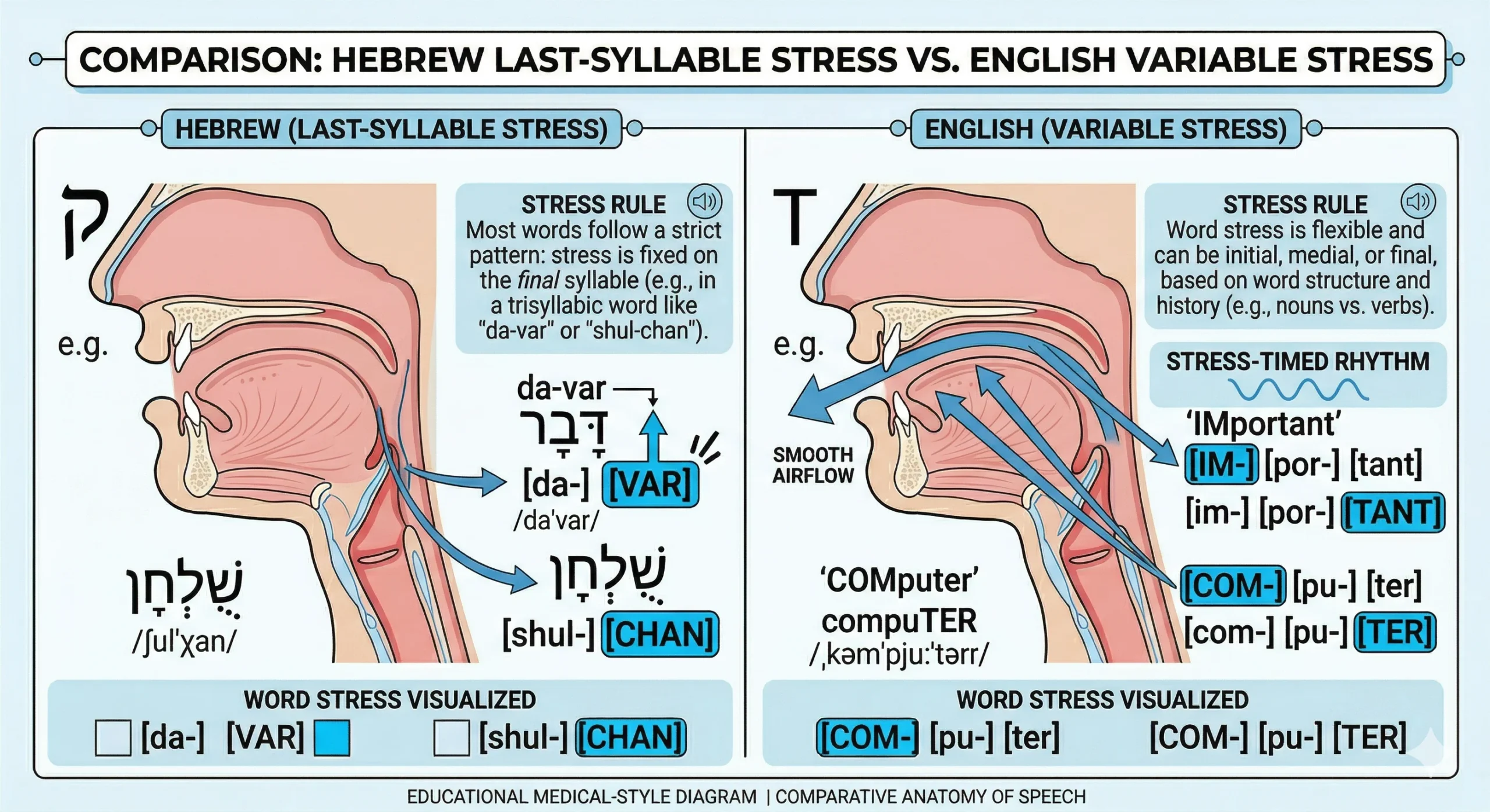 Hebrew pattern: Last-syllable stress applied to English words — “importANT,” “compuTER,” “probLEM,” “quesTION,” “comMON” Clear English: English word stress is unpredictable — it must be learned per word and is neither last nor first syllable as a rule