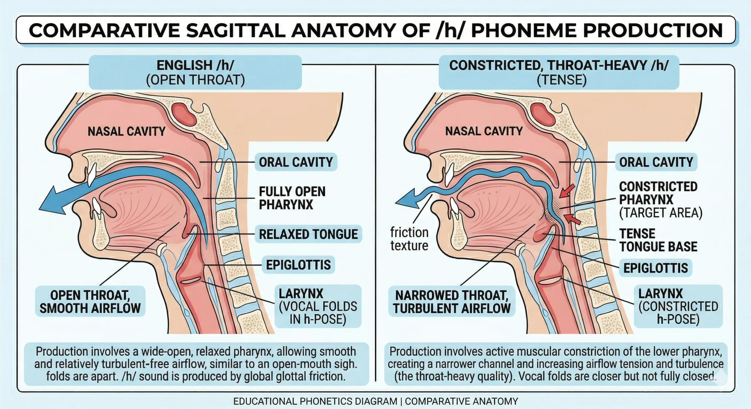 Hebrew pattern: English /h/ colored by pharyngeal habit — “hello” sounds like “khello,” “have” sounds like “khave,” “ahead” sounds like “a-khead,” entire vowels near pharyngeal-adjacent positions have a throaty texture Clear English: English /h/ is a completely open, voiceless exhale — the throat is fully relaxed, no constriction anywhere, no pharyngeal tension